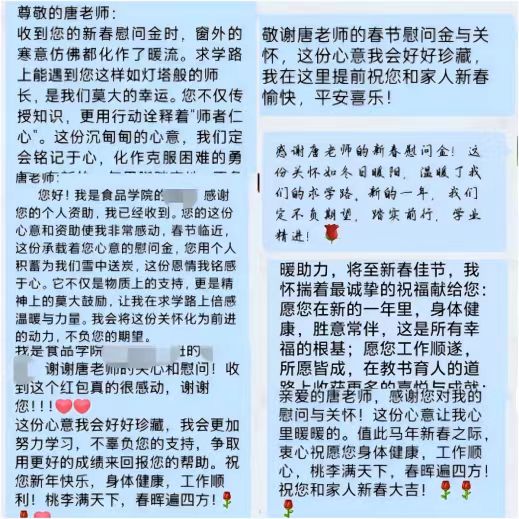 受助员工们对唐老师的无私帮助与深切关怀表达了由衷的感激。他们纷纷通过企业微信向唐老师致谢。同学们表示,唐老师的善举让他们在寒冬中感受到了浓浓的暖意,不仅给予了他们经济上的支持,更让他们获得了精神上的激励。他们一定不负老师期望,刻苦钻研,积极进取,以乐观的心态和实际的行动迎接未来的挑战,努力成长为社会需要的有用之才。