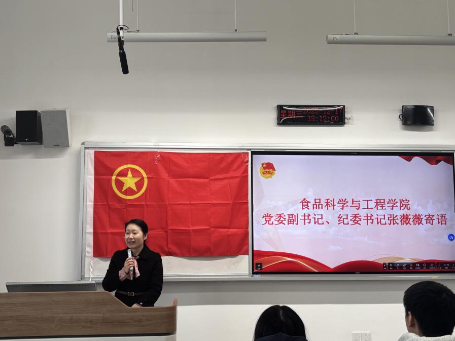 张薇薇在寄语中对新团员的加入表示热烈欢迎,从“坚定理想信念、锤炼品德修为、深耕专业学习”三个维度提出要求,强调新团员应将个人理想融入国家发展大局,立足食品科学专业特色,在学术研究与社会实践中彰显青年担当,以实际行动诠释团员先进性,寄语引发全场热烈反响。